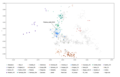 Principal Component Analyses (PCA) featuring a wide range of present-day and ancient samples from Europe and Asia, like the one below, show that Poltavka outlier clusters further west than most Corded Ware individuals from Germany. Right click and open in a new tab to view full size.