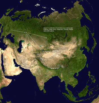 X marks the spot of the burial site of Poltavka sample I0432 from the Mathieson et al. 2015 dataset. This individual belongs to Y-chromosome haplogroup R1a-Z93(Z94+), which today accounts for well over 90% of the R1a lineages in Asia and peaks in frequency at over 60% in the northern parts of South Asia.