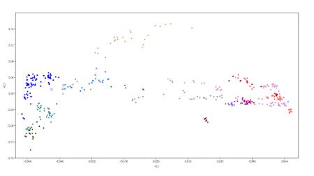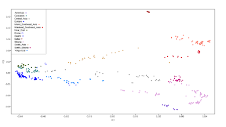 To see what's what, I ran a Principal Component Analysis (PCA) of all of the samples except the Congo Pygmies. I then removed four Siberians that behaved as if they had very recent European ancestry, and reran the PCA. Below are a few screen grabs from the latter analysis. The datasheet is available here.