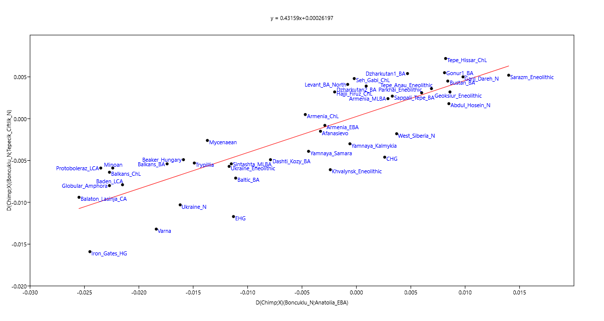 ReplyDeleteLooking at a negatively correlated pair of stats (reversing the (Chimp, X;Anatolia_MLBA, Tepecik_Ciftlik_N) stat to do so):