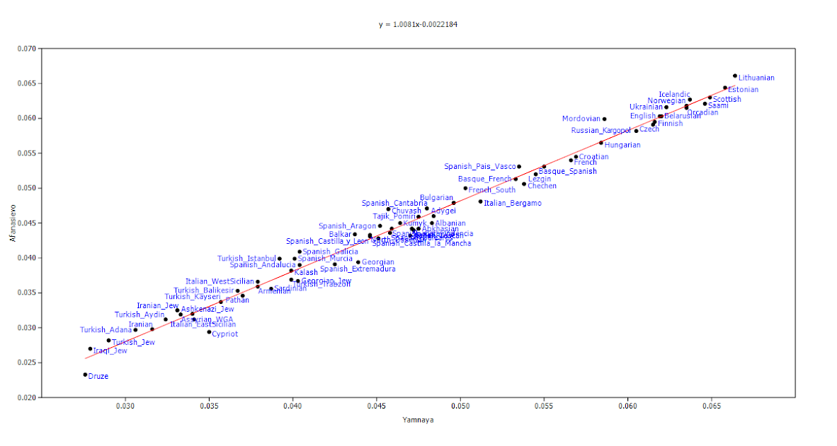 It's interesting and perhaps important that there's practically no difference between the two sets of Yamnaya samples published to date, despite the fact that they're from regions separated by ~1,000 kilometers. Yamnaya_Rise is from between the Black and Caspian seas, while Yamnaya_Haak from just north of the Caspian.